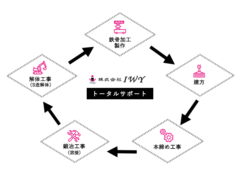 IWYは、鉄骨加工・製作から建方、本締め、鍛冶、解体まで、鉄骨工事をトータルサポートできるのが強みです。兵庫県から岡山県・大阪府・京都府、その他近隣地域まで幅広く対応していますので、各種鉄骨工事がご必要の際はお気軽に弊社までお問い合わせください。